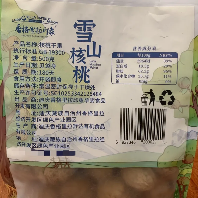 500 г/пакет | Шангри-Ла Импрешн | Шанхри-Ла Импрешн органическое масло грецкого ореха — это продукт премиального качества с социальной ответственностью. Оно соответствует национальному стандарту высшей категории, заслуженно считается «маслом грецкого ореха высшего сорта», а также получило множество престижных наград. Продукт признан «товаром поддержки бедных и фермеров» по утверждению Государственного управления по борьбе с бедностью, включён в программу «Сто уездов — сто брендов» Шанхая, обладает титулами «Ведущее лесохозяйственное предприятие Юньнани», «Знаковый бренд Юньнани», «Известная торговая марка Юньнани», а также награждён «Особой премией за научно-технический прогресс» правительством провинции Юньнань. Дополнительно, продукт отмечен сертификатами «Национальное предприятие с 5-A уровнем честности», «Бренд, заслуживающий доверия потребителей 315 в Китае» и «Сертификат первой категории в пищевой промышленности Китая», что подчёркивает его безупречное качество.